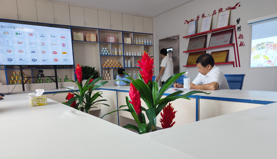 宋副市長一行首先來到大廳,在數個并排電子顯示屏前觀看并了解到企業企業智能數字化具體應用場景、新風系統的車間使用和公司發展歷程,給與了積極評價。隨即來到展廳,宋副市長逐一向公司總經理了解產品研發、工藝技術、銷售市場、產品布局和企業發展規劃等。尤其是對公司新研發并已批量投產的“玻璃瓶替代者–PP瓶”新品表現出濃厚興趣,在確認該新品解決了“易碎裂、玻璃渣、太沉重”的產品行業疼點;了解企業在國內首家采用摸內貼,熱轉印技術進行工藝突破時表示出高度贊賞。