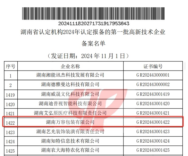 國(guó)家級(jí)“高新技術(shù)企業(yè)” 稱號(hào)不僅是一份榮譽(yù),更是一份沉甸甸的責(zé)任與使命! 萬(wàn)容包裝將一如既往在國(guó)家政策的大力支持與引導(dǎo)下,堅(jiān)持以科技創(chuàng)新驅(qū)動(dòng)企業(yè)發(fā)展,鍛造新質(zhì)生產(chǎn)力,推動(dòng)食品包裝容器行業(yè)在安全、數(shù)字化與智能化的進(jìn)程中拓展新篇章!